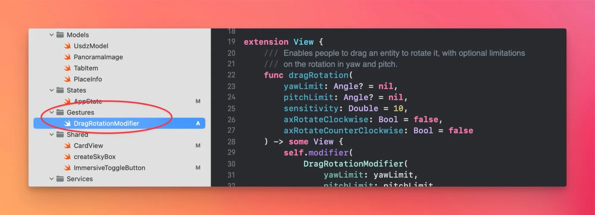 建议在 Xcode 项目中,创建一个 Gestures 文件夹,专用用于管理手势控制相关的组件。在这个文件夹中,创建 DragRotationModifier.swift 文件,完整代码如下(該组件参考自 Apple 提供的 HelloWorld 演示项目,其提供了优秀的用户体验):