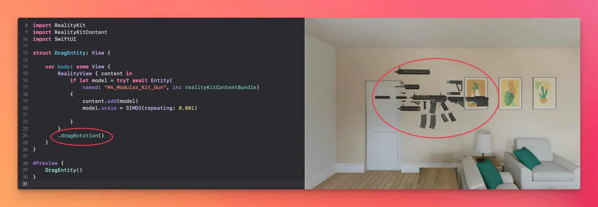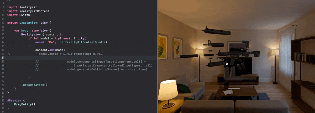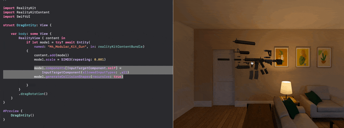 }将 .dragRotation()修改器添加到 RealityView,以启用它。