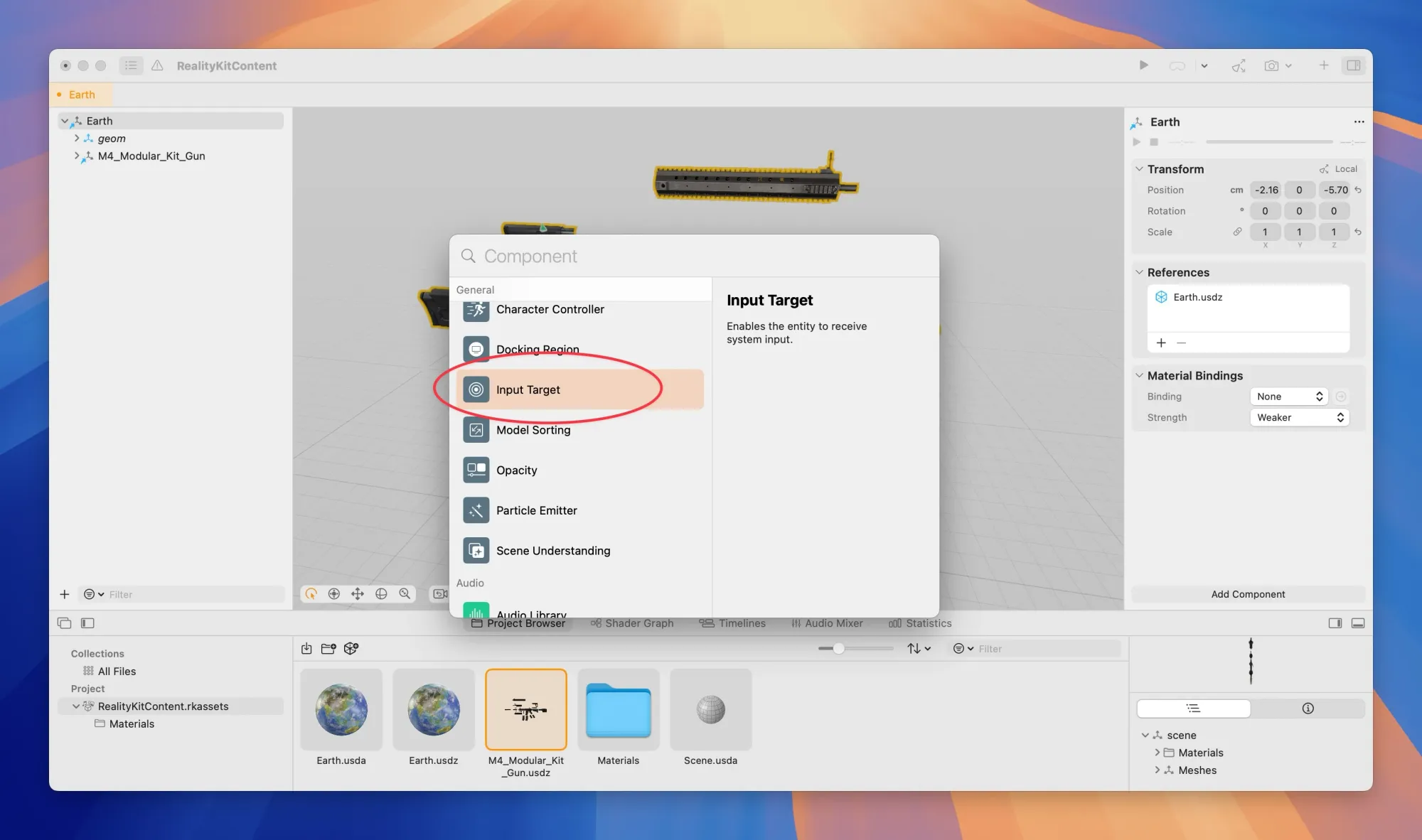 通过 Reality Composer Pro 添加 InputTarget 和 Collision 组件