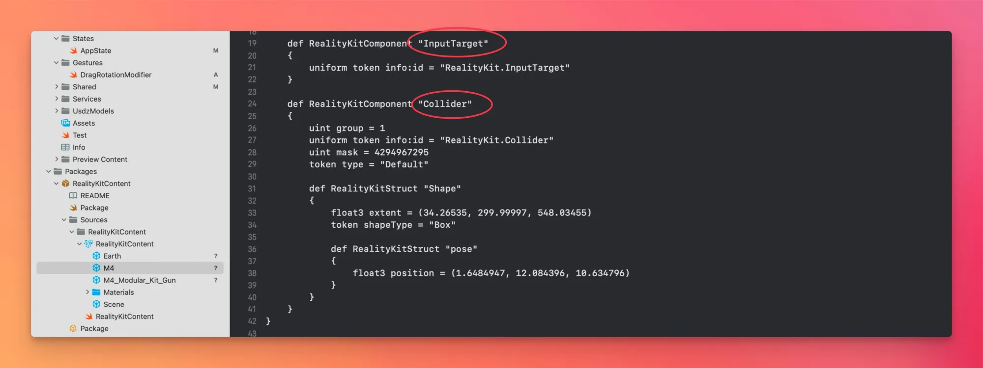 如果你在 Xcode 中选中模型,并选择查看源代码,会发现 Reality Composer Pro 也还是为 Entity 添加了这两个组件: