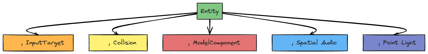 在 RealityKit 中,一个 Entity 是一个基本的构建块,可以附加多个组件来扩展其功能。例如,为了让 Entity 能够渲染形状,我们可以将 .usdz 模型添加到 ModelComponent 组件。如果要实现空间音频,可以为 Entity 添加 SpatialAudio 组件。