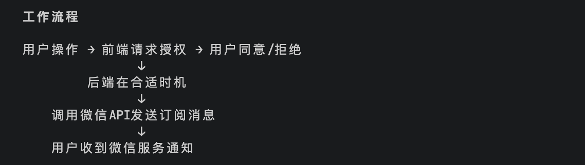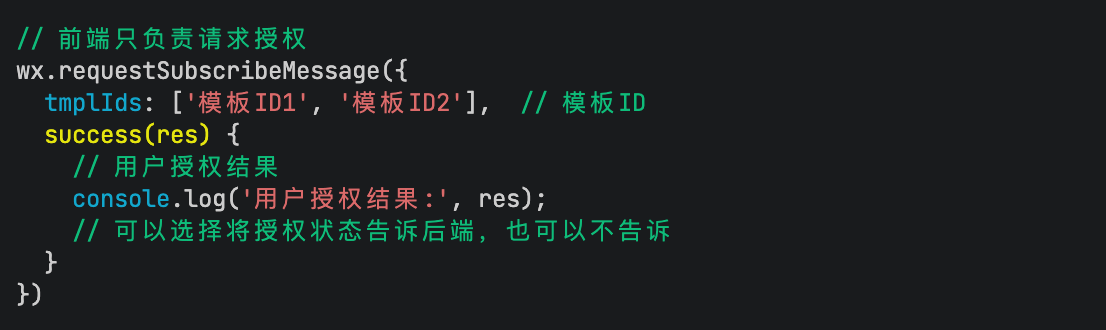 前端只需要在合适的时机调用 wx.requestSubscribeMessage 请求用户授权即可,后端负责所有的消息发送逻辑。